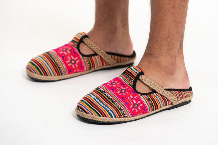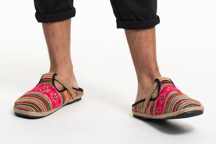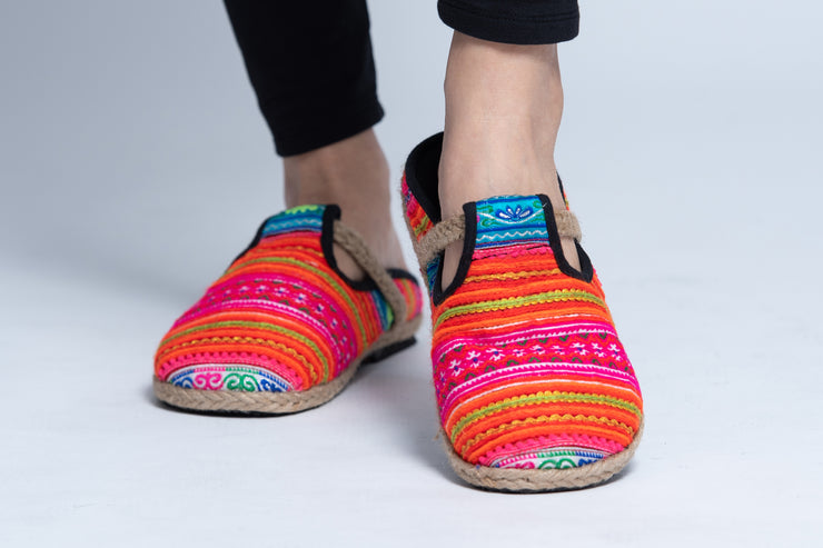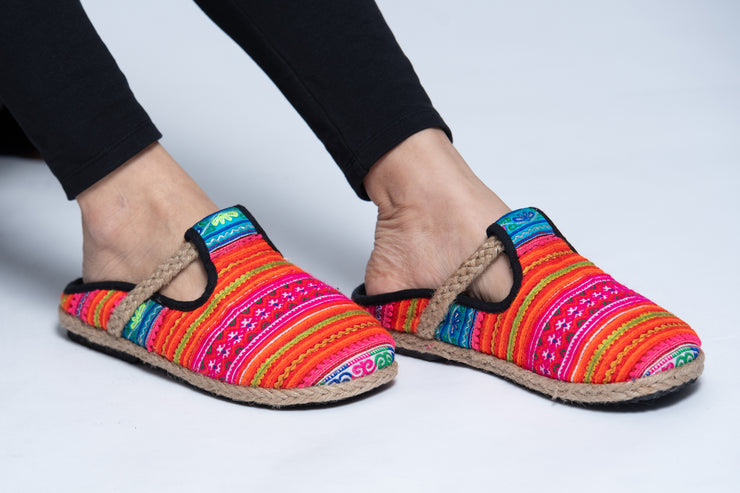 Thai handmade slipper sandals. Made with Hmong traditional embroidered fabric and decarated with woven natural jute straps.