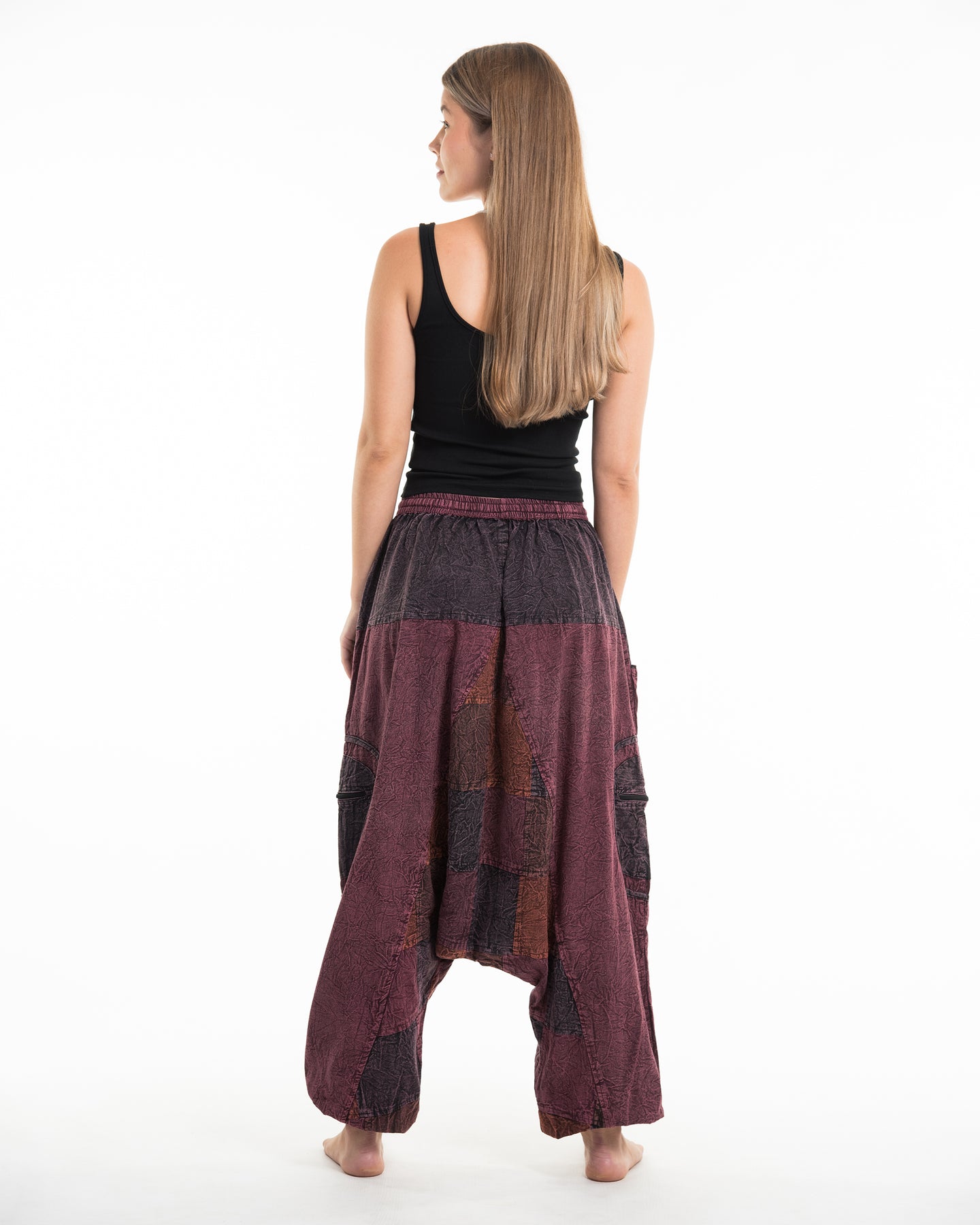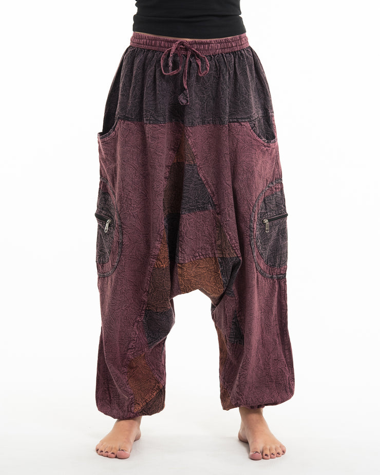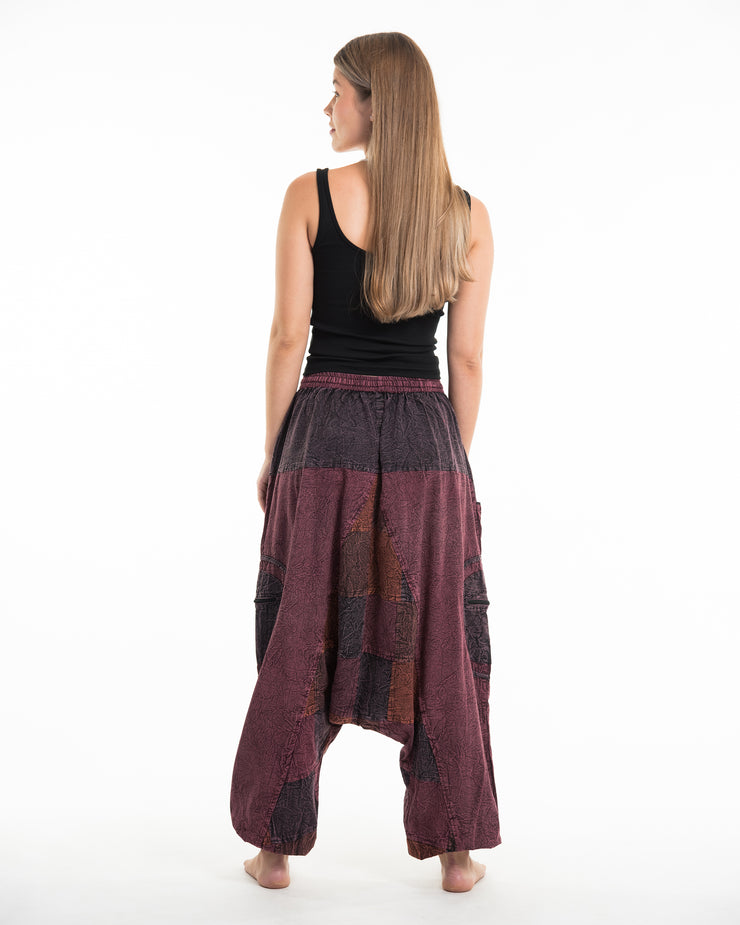 Perfectly handcrafted Indian patchwork stone washed cotton pants in low cut style pants. Maximum comfort with elastic drawstring waist and drawstring at waist.