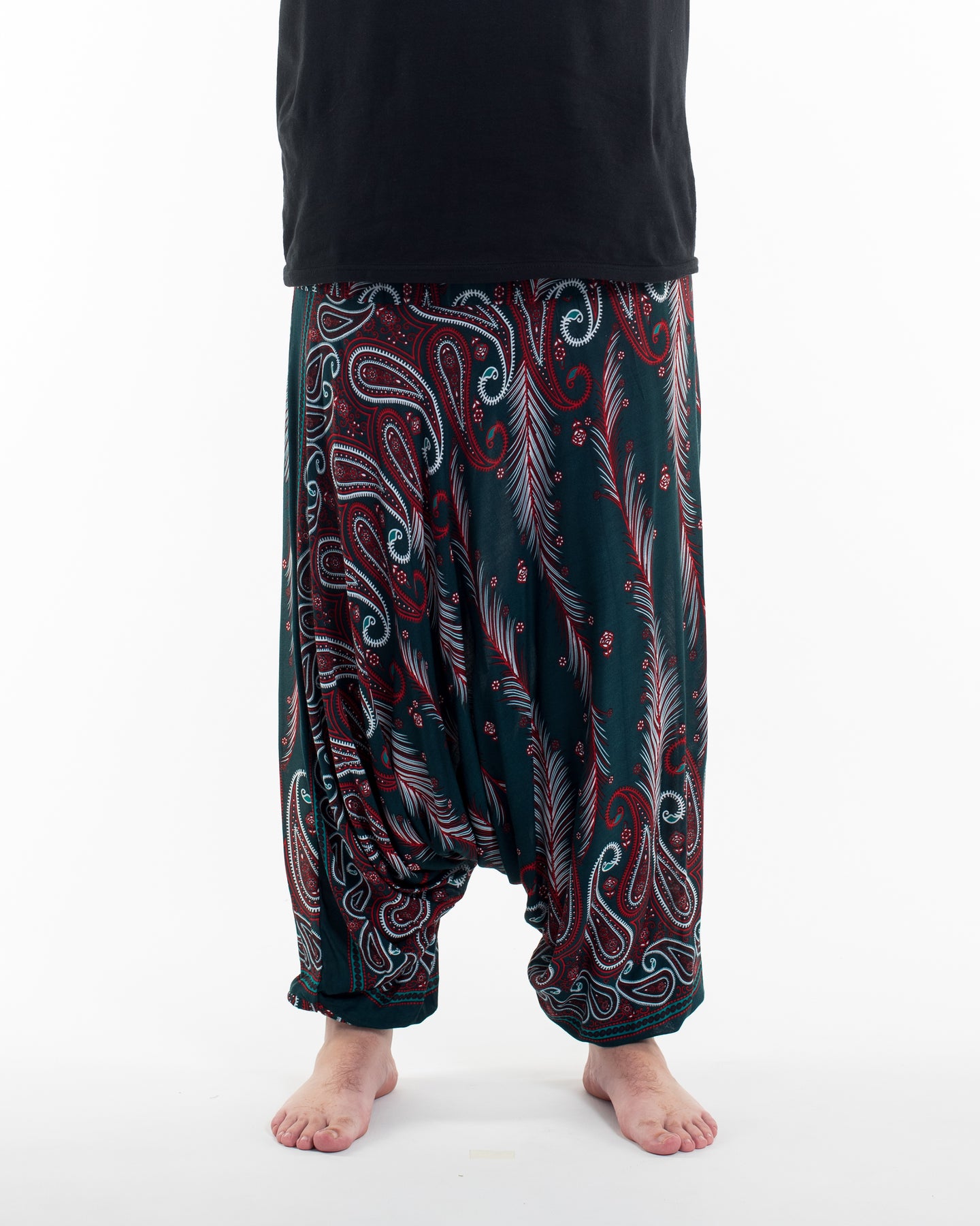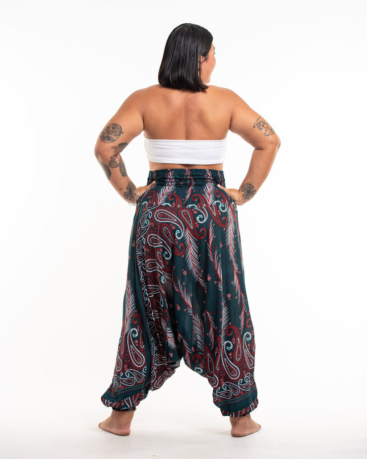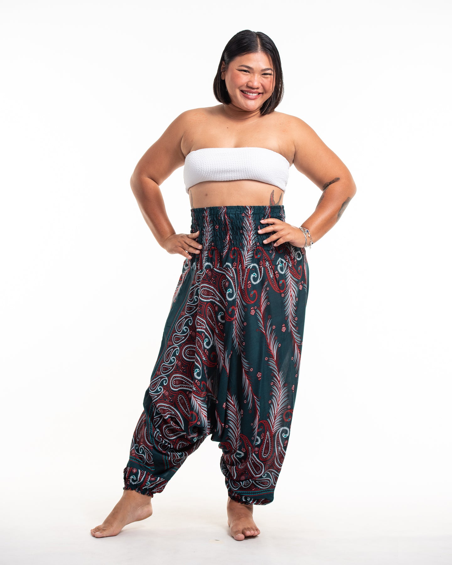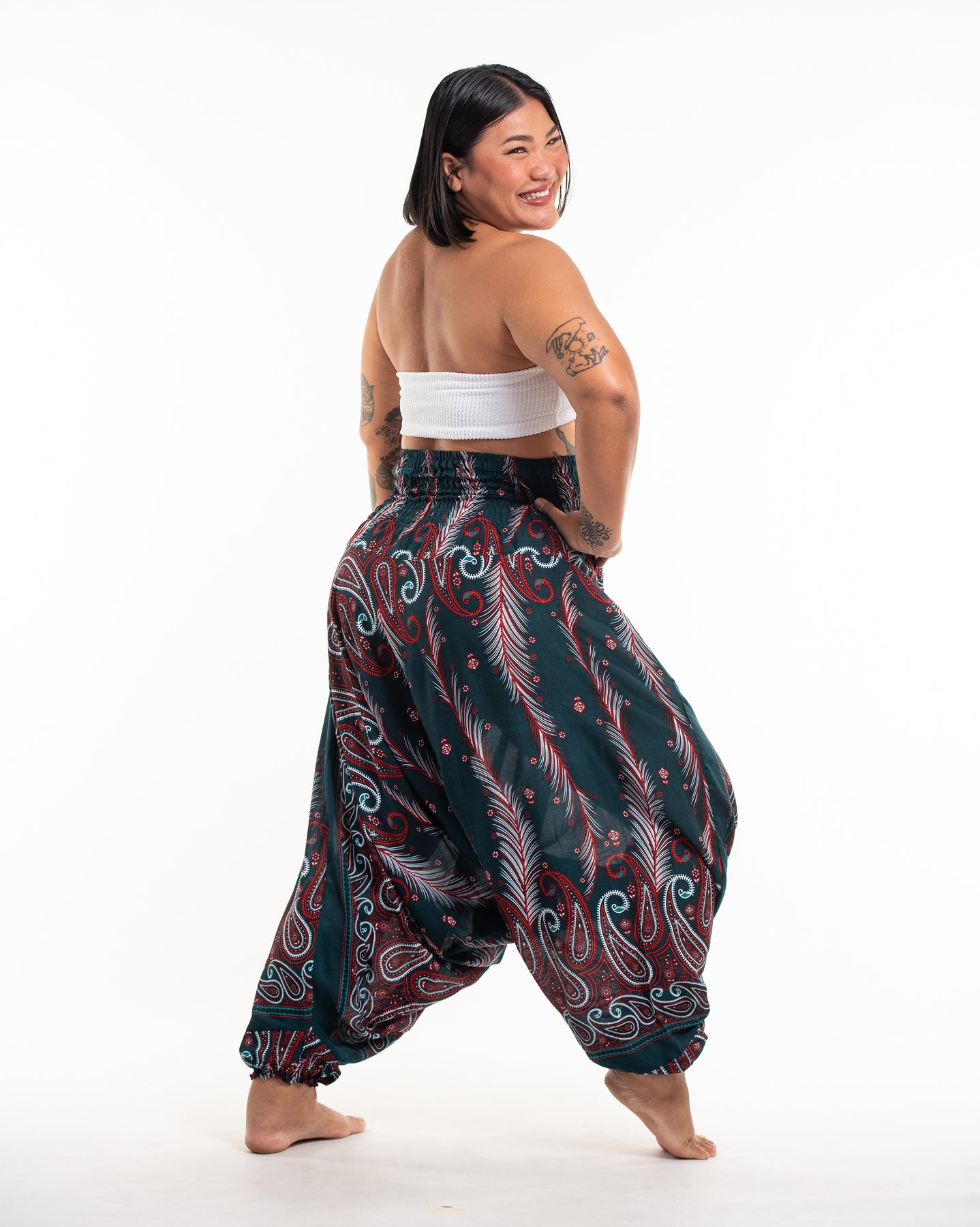 Unisex Plus Size Paisley Feathers Drop Crotch Jumpsuit Harem Pants in Green