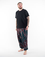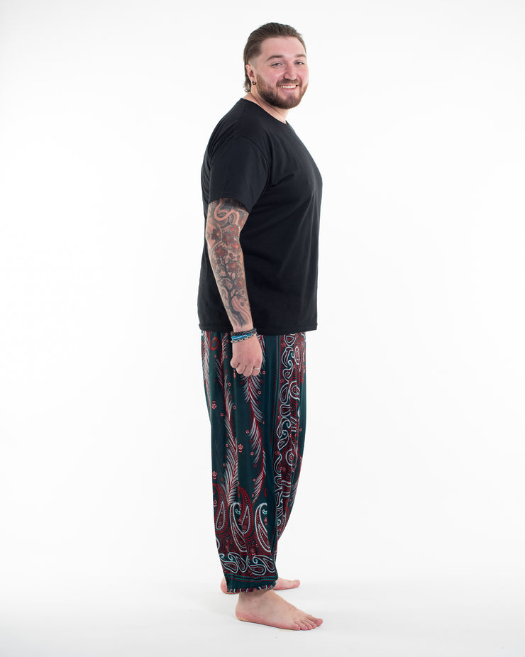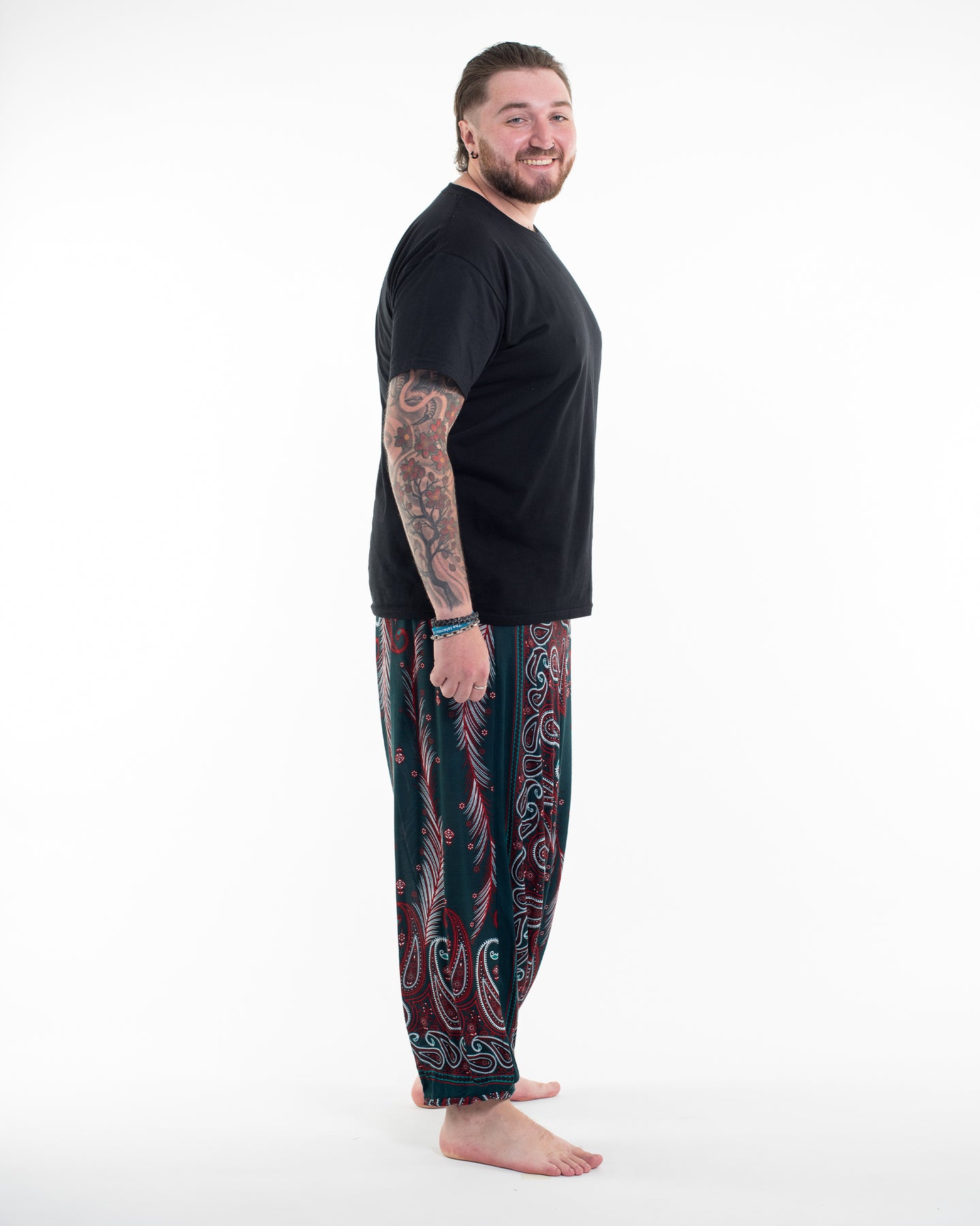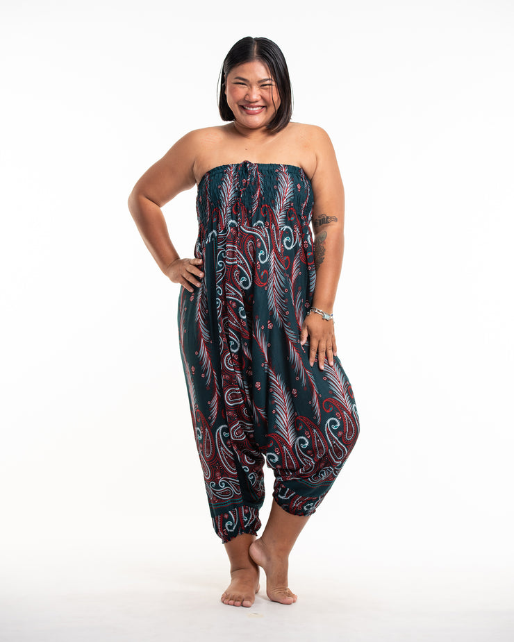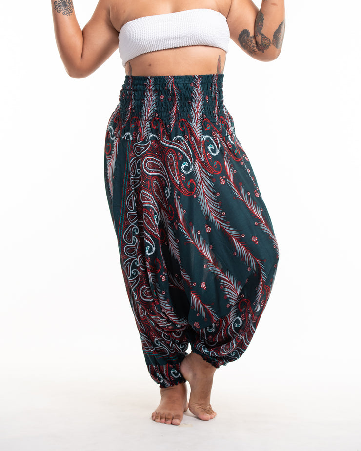 Unisex Plus Size Paisley Feathers Drop Crotch Jumpsuit Harem Pants in Green