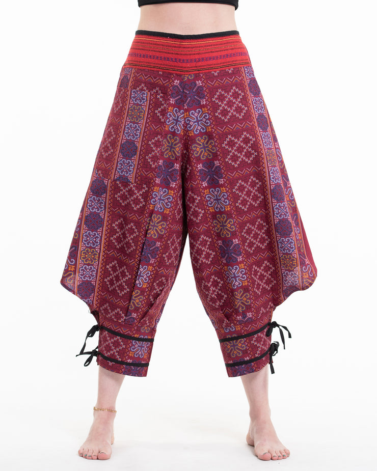 Unisex Clovers Thai Hill Tribe Fabric Harem Pants with Ankle Straps in Maroon