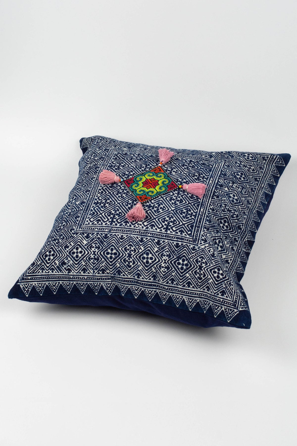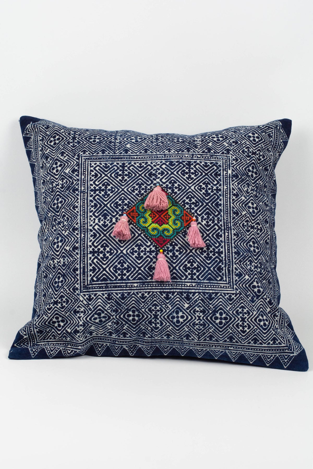 Hmong Indigo Batik Cotton Pillowcase with Light Pink Tassels