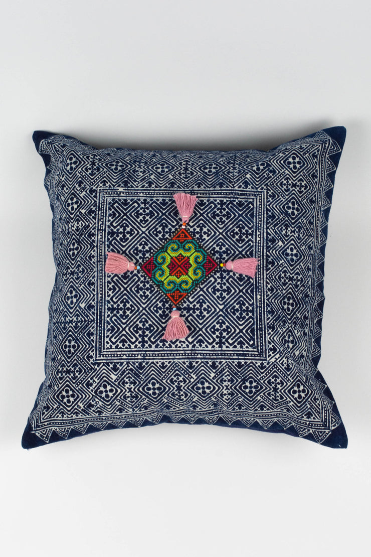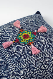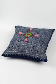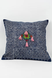 Hand Made Hill Tribe Indigo Cotton Pillowcase with Colorful Embroidery and Beautiful Tassels