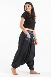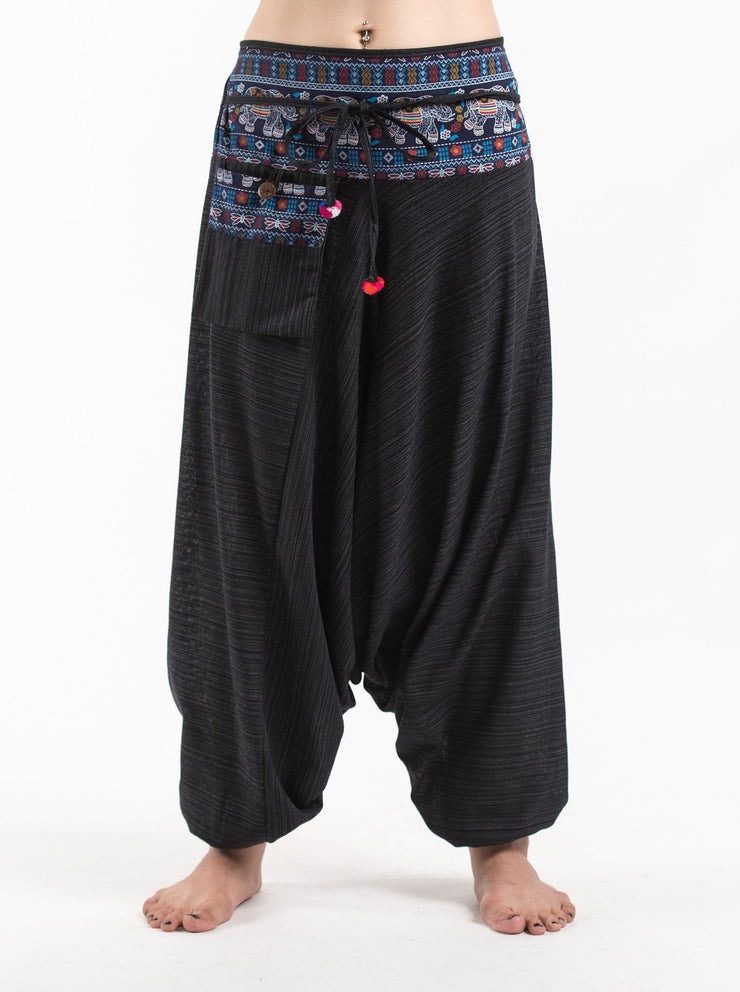 Pinstripe Cotton Low Cut Harem Pants With Elephant Trim and a side pocket.