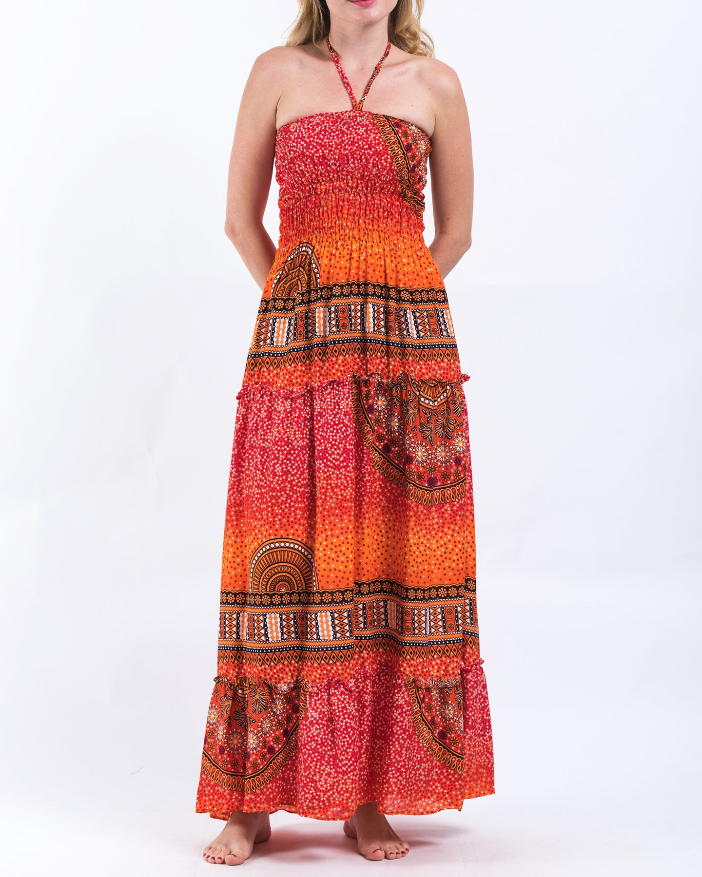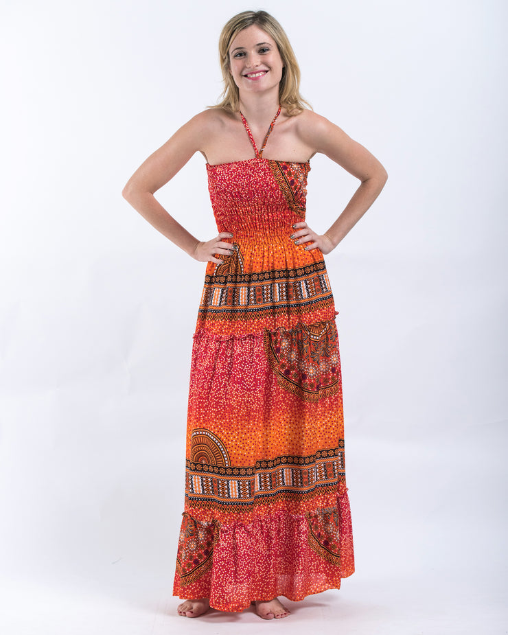 Have a beautiful look with our bohemian design bandeau Maxi Dress , Smocked Dress with a smocked top and removable halter straps, made with Thai rayon fabric – best for summer beach time from sunbathing to sightseeing.