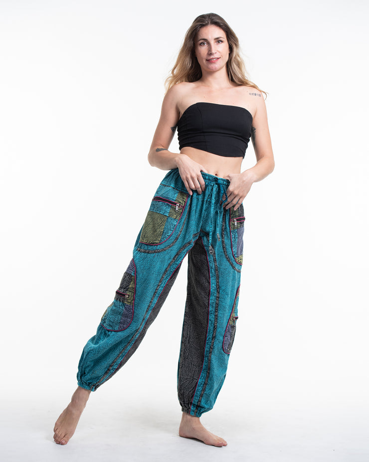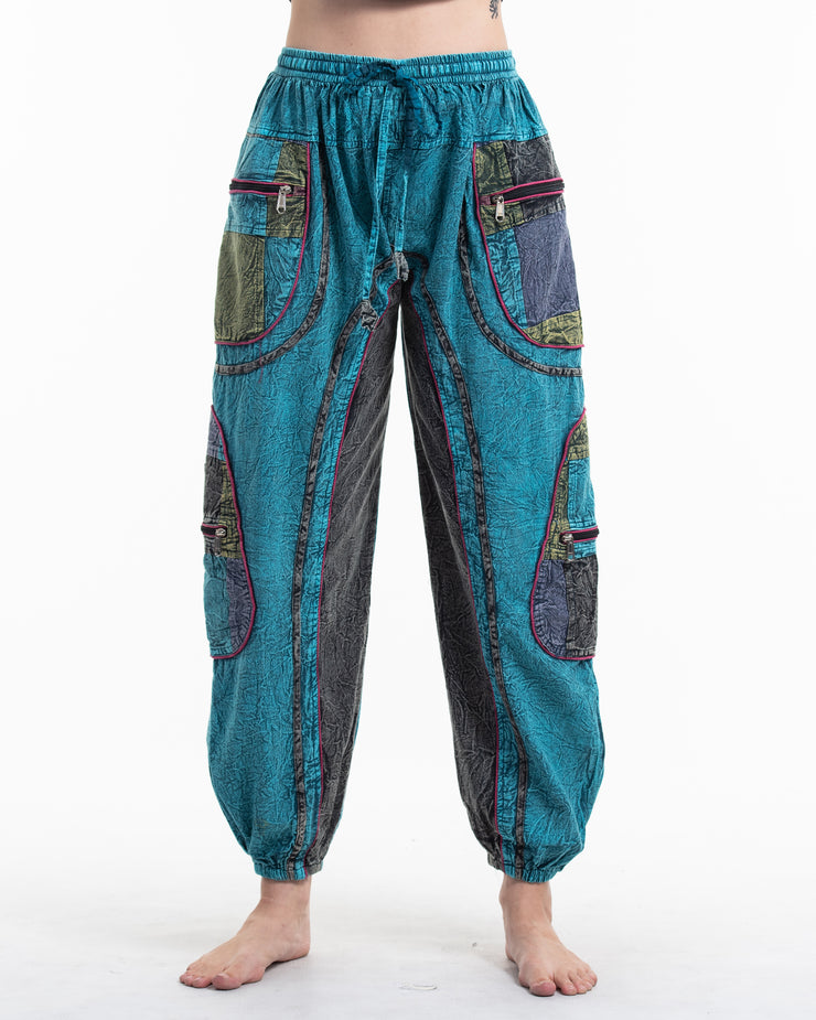 Perfectly handcrafted Indian patchwork stone washed cotton pants in cargo style pants big pockets and zippers. Maximum comfort with elastic drawstring waist and drawstring at waist.