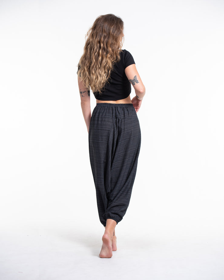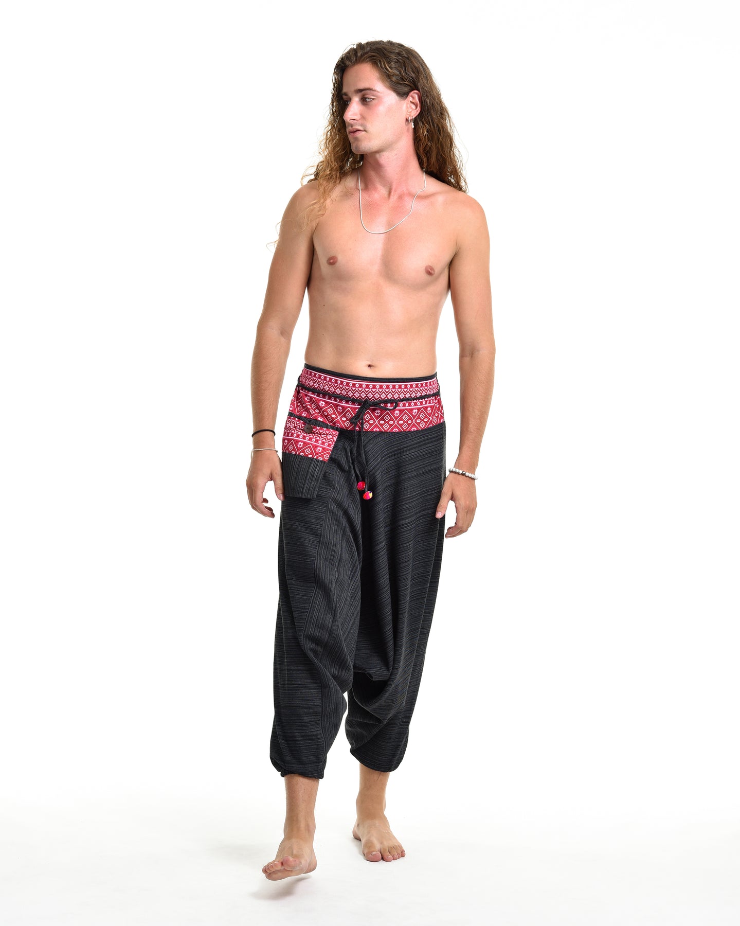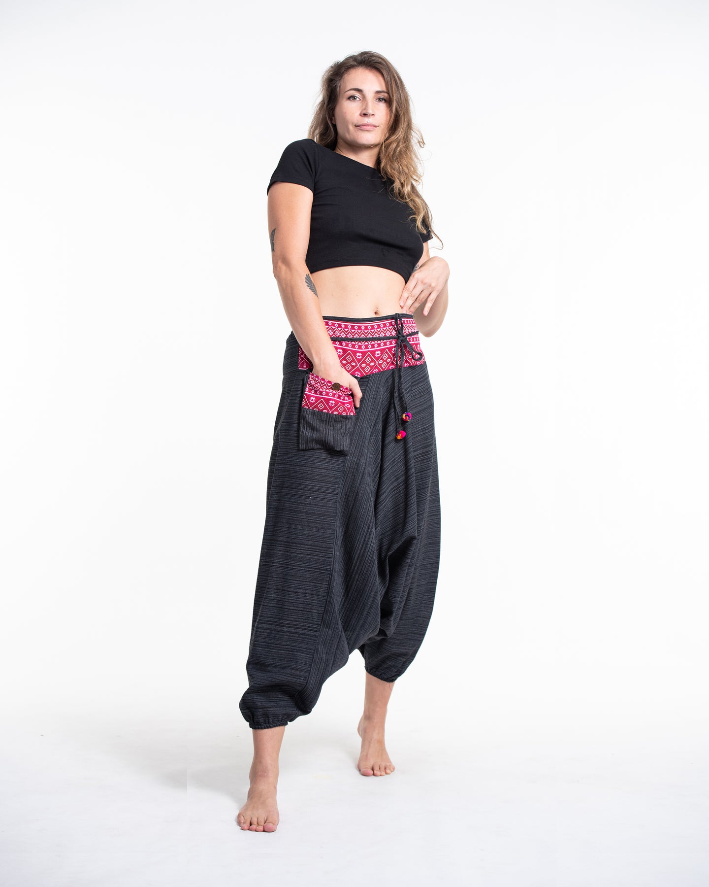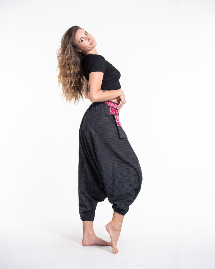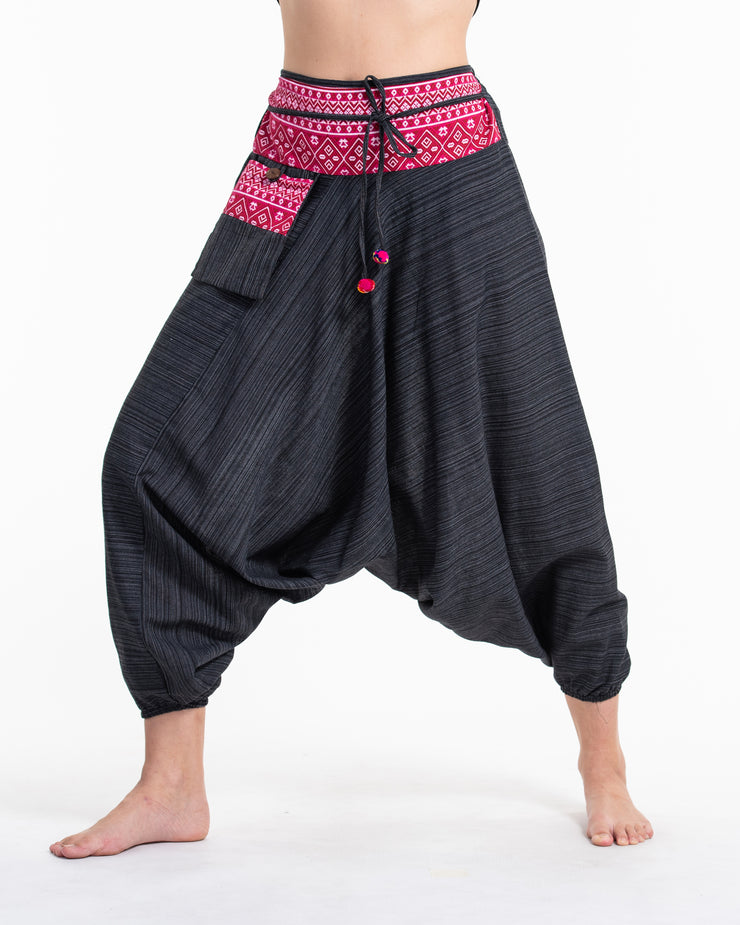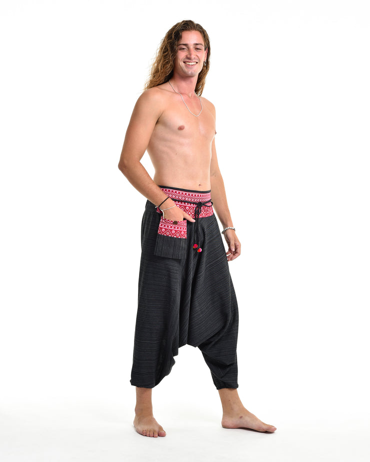 Pinstripe Cotton Low Cut Harem Pants With Hill Tribe Trim and side pocket.